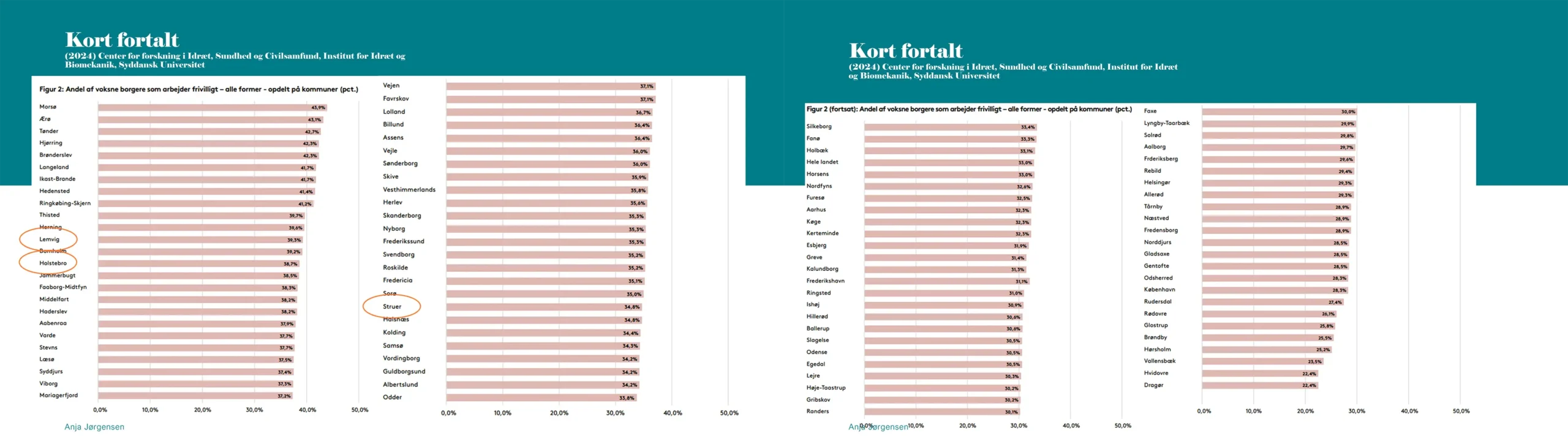 Men hvis vi zoomer ind og i stedet for at kigge på nationale tal, kigger på lokale tal, så ser vi at børn fra en lav socio-økonomisk status i landområderne klarer sig betydeligt bedre end børn fra tilsvarende familier i byområderne. Vi kan også se at frivilligheden i Vestdanmark er betydeligt højere end den er i Østdanmark. Blandt andet kan vi se at frivilligheden i både Lemvig og Holstebro kommune er i top-15 på landsplan.