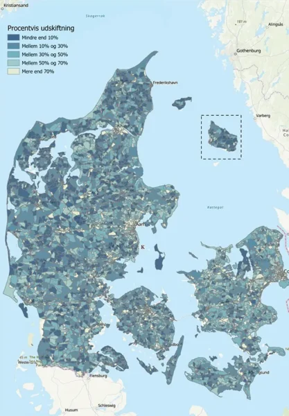 Ligeledes kan vi se at udskiftningen i landområderne, og i Vestdanmark især, er noget lavere end den er på landsplan. Det betyder at vi vælger at blive boende, og hvis man kobler det med frivilligheden, er det nok ikke helt forkert at sige at vi danner et tættere forhold til vores områder end man gør andre steder.