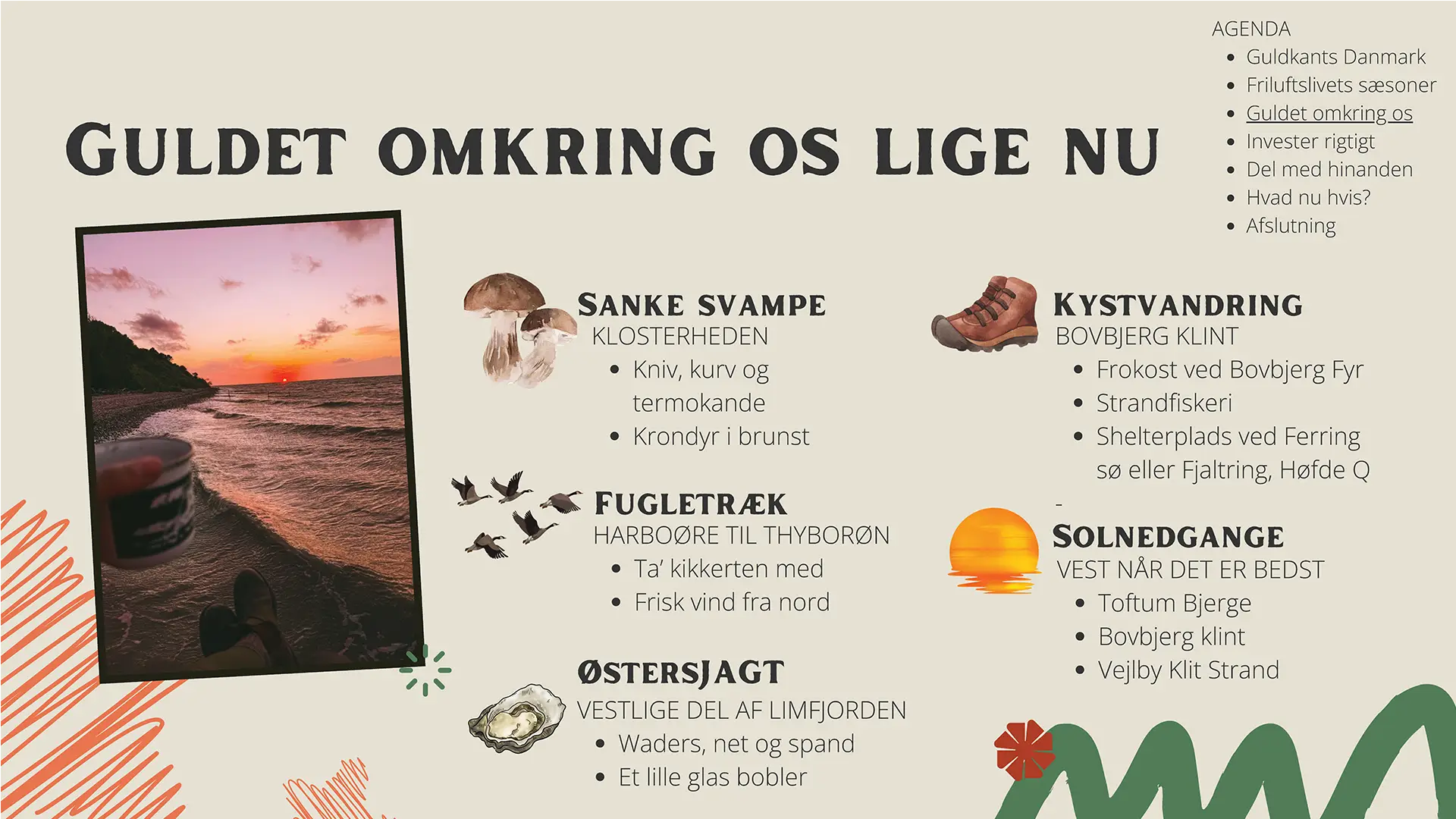 Hver årstid gemmer på sine egne guldklumper og på sine egne unikke oplevelser. Fra svampeture over vinterbadning, shelterhygge eller fuglekig, så er Vestjylland en overflod af skøn natur og gode oplevelser. Hvis vi bliver bedre til at skabe en forbindelse til vores unikke natur, så kan det godt være at man flytter væk for at studere eller arbejde, men sandsynligheden for at man flytter hjem igen, bliver ekspotentielt større.